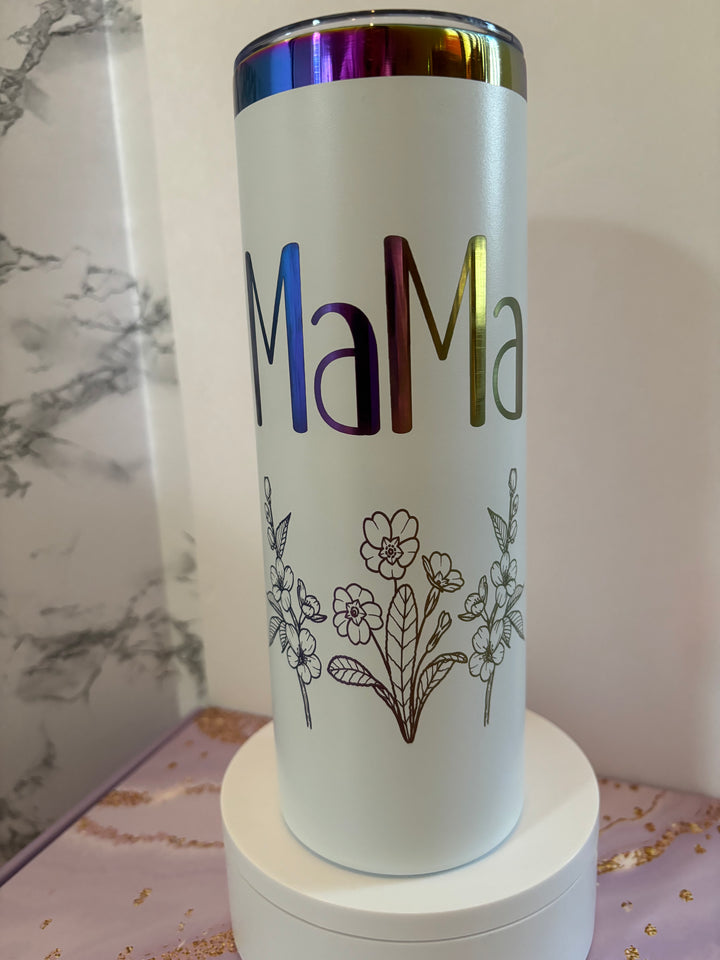 Celebrate motherhood with this elegant 20 oz tumbler featuring personalized birth flowers representing each child. Crafted for durability and designed to keep beverages hot or cold for hours, it’s a meaningful and practical gift for any mom. Perfect for daily use, it beautifully combines functionality with a heartfelt tribute to her children.