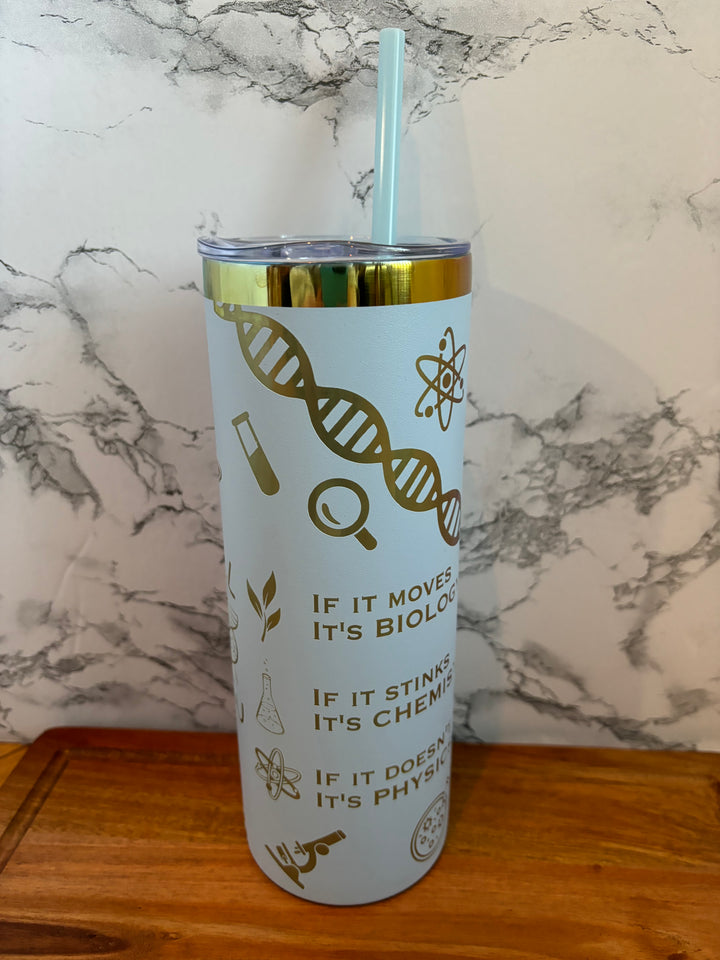 The Science Cup is a 20 oz insulated tumbler designed to keep drinks cold for hours, making it perfect for science teachers and enthusiasts. Its durable construction ensures long-lasting use, while the distinctive design celebrates a passion for science in both professional and casual settings. Stay refreshed and inspired throughout the day with this practical and stylish cup.